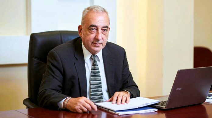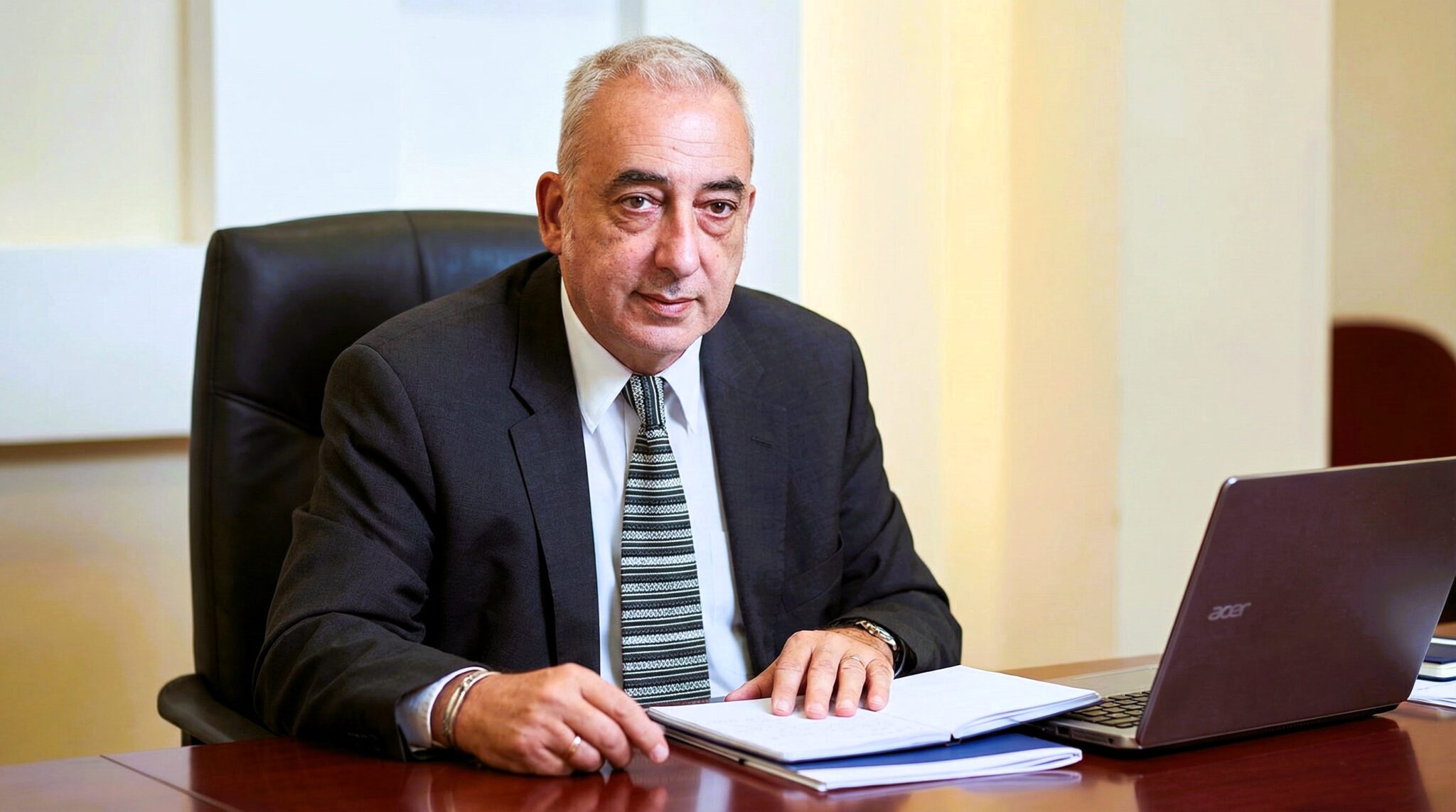 Ο Πλάμεν Τόντσεφ καθισμένος στο γραφείο του κατά τη διάρκεια συνέντευξης, με έγγραφα και έναν φορητό υπολογιστή, σε επαγγελματικό περιβάλλον.