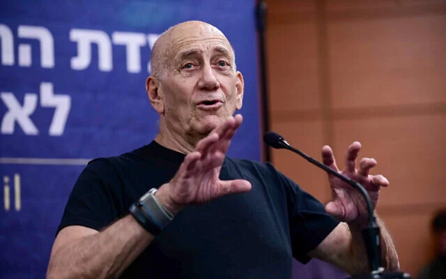 Φωτογραφία: ο Εχούντ Όλμερτ καταθέτει κατά τη διάρκεια ακρόασης της επιτροπής πολιτικής έρευνας για τη σφαγή της 7ης Οκτωβρίου, στο Τελ Αβίβ, στις 8 Αυγούστου 2024. (Tomer Neuberg/Flash90)