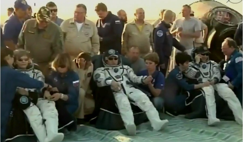 Η αστροναύτης της ΝΑSA Πέγκυ Γοιυίτσον, η οποία πραγματοποίησε πολαπλά ρεκόρ στο διάστημα για τις ΗΠΑ, κατά τη διάρκεια της αποστολής της έξω από τον Διεθνή Διαστημικό Σταθμό, μαζί με τον Πόντιο κοσμοναύτη Φιοντόρ (Θεόδωρος) Γιουρτσίχιν-Γραμματικόπουλο και τον Αμερικανό αστροναύτη Τζακ Φίσερ, όλοι τους μέλη της «αποστολής 52», προσγειώθηκαν με ασφάλεια σήμερα στο Καζακστάν.