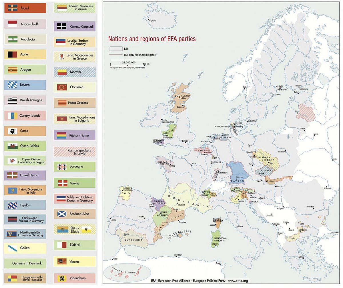 Η Γερμανία έχει συστηματικά στηρίξει τον καταλανικό σωβινισμό στο παρελθόν. Για παράδειγμα οι Γερμανοί πράσινοι ευρωβουλευτές, όπως και οι πράσινοι των άλλων ευρωπαϊκών χωρών, ανήκουν στην ίδια κοινοβουλευτική ομάδα με την Ελεύθερη Ευρωπαϊκή Συμμαχία (EFA). Στην EFA συμμετέχουν η αποσχιστική Ρεπουμπλικανική Αριστερά της Καταλονίας (ERC) και άλλα αποσχιστικά κόμματα από τις υπόλοιπες περιοχές της Ισπανίας. Προβάλλοντας έναν συγκεκριμένο χάρτη στην ιστοσελίδα της, η EFA προπαγανδίζει τον κατακερματισμό πολλών ευρωπαϊκών εθνών σε επιμέρους, εθνοτικά μικροκρατίδια. Έτσι, για παράδειγμα, υποστηρίζει τον διαχωρισμό της Ισπανίας σε επτά κρατίδια, δυο από τα οποία, η Καταλονία και η χώρα των Βάσκων, προσαρτούν και γαλλικά εδάφη. Η Γαλλία, επίσης, προβλέπεται να χάσει ένα μεγάλο μέρος της εθνικής της επικράτειας από την απόσχιση ενός κράτους που θα λέγεται Βρετάνη, και μιας περίεργης οντότητας που θα καλείται «Οξιτανία», και θα προσαρτά επίσης και την Βαλλονία του Βελγίου. Αυτό, με την σειρά του δεν θα υφίσταται ως έθνος. Σύμφωνα με αυτόν τον χάρτη, η Γερμανία θα παραμείνει η μόνη χώρα που θα αυξήσει την επικράτειά της. Ο χάρτης της EFA την παρουσιάζει έχοντας προσαρτήσει την Αυστρία, τις γερμανόφωνες περιοχές Ελβετίας, το Νότιο Τίρολο καθώς και το Ανατολικό Βέλγιο, πράγμα που θα την καθιστούσε κυρίαρχη σε όλη την Ευρώπη εξαιτίας των μεγεθών της. Η Μεγάλη Βρετανία, επίσης θα περιοριζόταν. Το Σκοτσέζικο Εθνικό Κόμμα (SNP) που καλεί σήμερα για την διάσπαση της Βρετανίας ως έθνους, είναι μέλος της EFA. Δυο από τους εκπροσώπους του δουλεύουν στενά με το κόμμα των Γερμανών Πρασίνων, και την ευρωπαϊκή κοινοβουλευτική τους ομάδα (5)