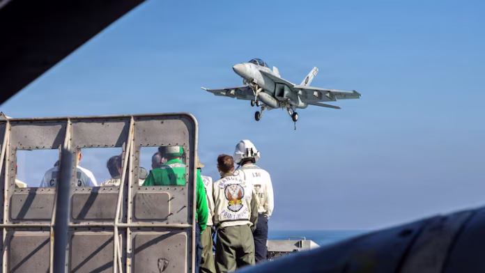 Αεροπλανοφόρο κλάσης Nimitz του Πολεμικού Ναυτικού των ΗΠΑ, USS Abraham Lincoln, επιχειρεί στην Αραβική Θάλασσα. Ένα F/A-18F Super Hornet ετοιμάζεται για προσνήωση στο κατάστρωμα πτήσης του USS Abraham Lincoln (CVN 72) στην Αραβική Θάλασσα, 15 Φεβρουαρίου 2026. U.S. Navy/Mass Communication Specialist Seaman Daniel Kimmelman/Handout μέσω REUTERS.