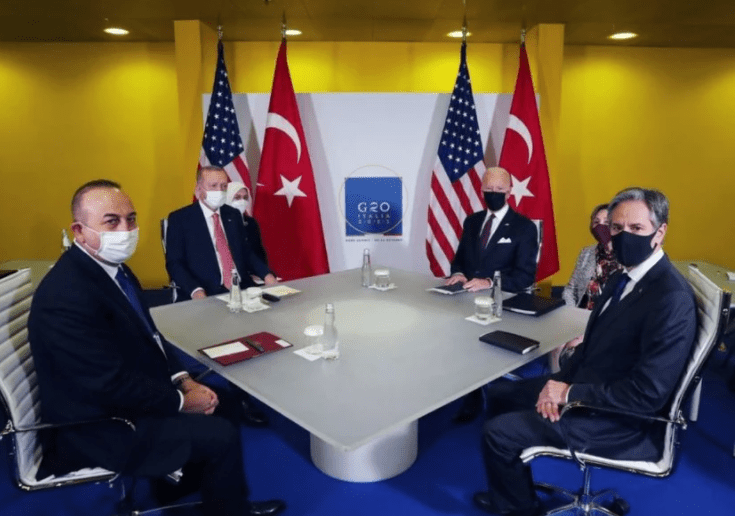 Ολοκληρώθηκε η συνάντηση του Τζο Μπάιντεν με τον Ρετζέπ Ταγίπ Ερντογάν στο πλαίσιο της συνεδρίασης των G20 στη Ρώμη. Το παρών έδωσαν ο υπουργός Εξωτερικών των ΗΠΑ, Άντονι Μπλίνκεν, κι ο Τούρκος ομόλογός του, Μεβλούτ Τσαβούσογλου.