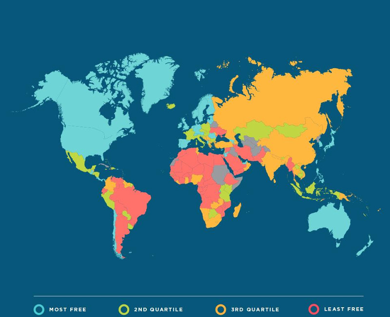 Ο βαθμός οικονομικής ελευθερίας υπολογίζεται με βάση τους θεσμούς και τις πολιτικές που εφαρμόζει κάθε χώρα σε πέντε πεδία:
