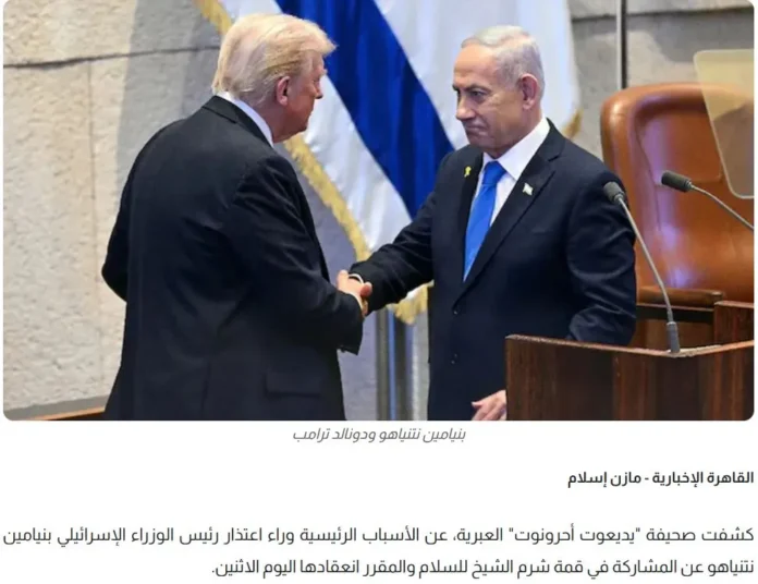 Η εφημερίδα Yedioth Ahronoth αποκάλυψε τους πραγματικούς λόγους που ώθησαν τον Ισραηλινό πρωθυπουργό Μπενιαμίν Νετανιάχου να ακυρώσει τη συμμετοχή του στη Σύνοδο Κορυφής του Σαρμ ελ-Σέιχ, η οποία φιλοξενεί διεθνή συμμετοχή με στόχο τον τερματισμό του πολέμου στη Λωρίδα της Γάζας.