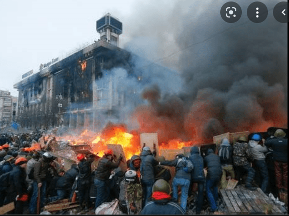 Μια αυτοαποκαλούμενη κυβέρνηση επιλεγμένη κύρια από τις ΗΠΑ (το γνωστό «fuck Europe” της Βικτόριας Νούλαντ) που στηριζόταν στις «ξιφολόγχες» των ταγμάτων εφόδου (εθελοντικών ταγμάτων) με τους αγκυλωτούς σταυρούς, τα τατουάζ τους, αλλά και στην παθητική συμμόρφωση των δυνάμεων ασφαλείας, που δεν ήθελαν να αναλάβουν την ευθύνη και απλώς περίμεναν να δουν τι θα συμβεί, ποιος θα επικρατήσει.