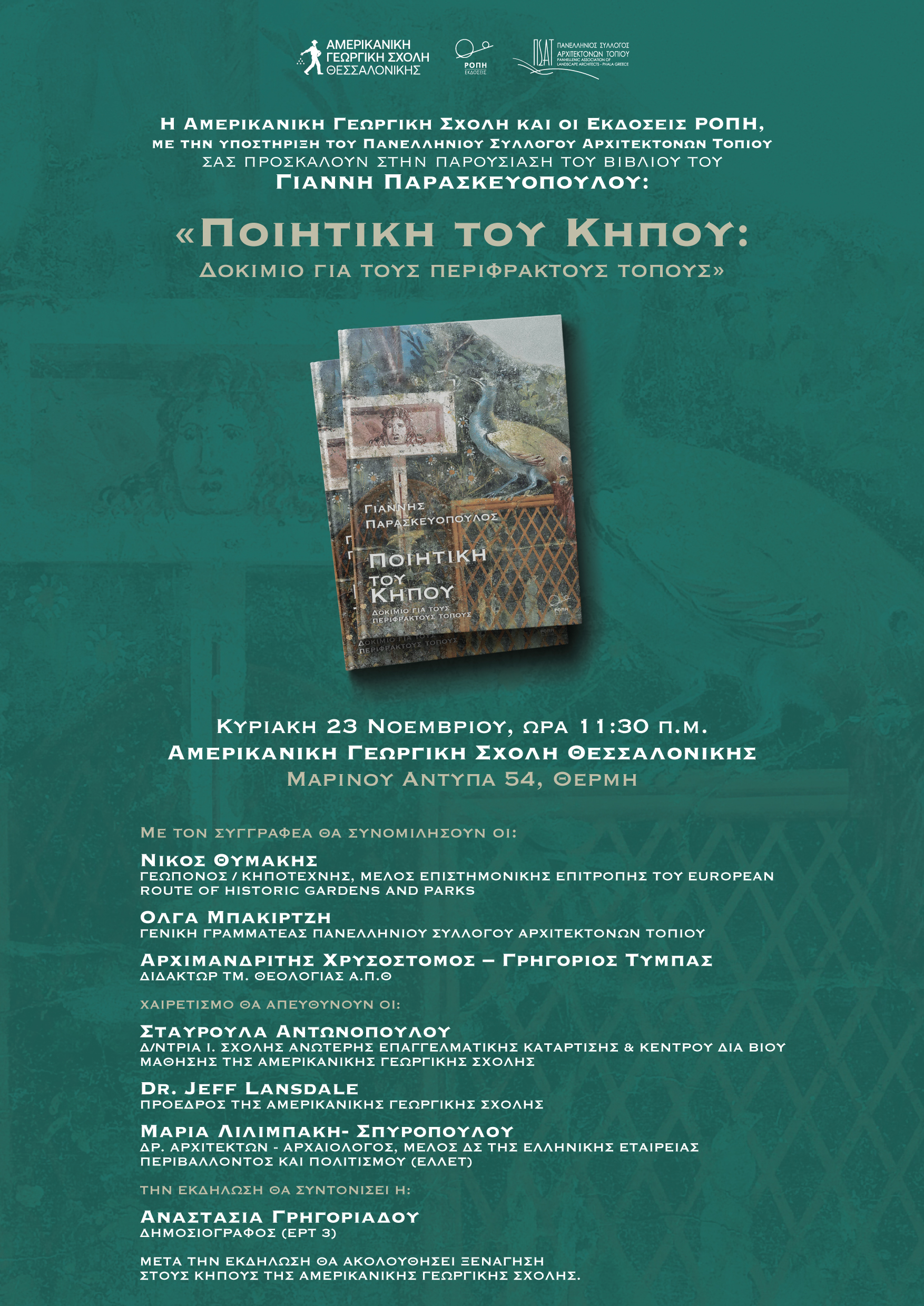 Την παρουσίαση του νέου βιβλίου του Γιάννη Παρασκευόπουλου με τίτλο «Ποιητική του Κήπου: Δοκίμιο για τους περιφραχτούς τόπους», συνδιοργανώνουν η Αμερικανική Γεωργική Σχολή Θεσσαλονίκης και οι Εκδόσεις Ροπή, με την υποστήριξη του Πανελλήνιου Συλλόγου Αρχιτεκτόνων Τοπίου. Θα πραγματοποιηθεί την Κυριακή 23 Νοεμβρίου, στις 11:30 π.μ., στις εγκαταστάσεις της Αμερικανικής Γεωργικής Σχολής Θεσσαλονίκης (Μαρίνου Αντύπα 54, Θέρμη).