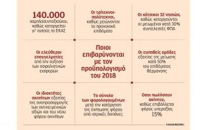 Μισθωτοί, χαμηλοσυνταξιούχοι, ιδιοκτήτες ακινήτων, τρίτεκνες και πολύτεκνες οικογένειες θα σηκώσουν τα βάρη του προϋπολογισμού του 2018, στη διάρκεια του οποίου το πρωτογενές πλεόνασμα πρέπει να εκτοξευτεί στο 3,5% του ΑΕΠ. Το κόστος των νέων μέτρων ανέρχεται στο 1,9 δισ. ευρώ, με τους χαμηλοσυνταξιούχους, δηλαδή αυτούς που δικαιούνται το κοινωνικό μέρισμα, να καλούνται να συνεισφέρουν τα περισσότερα.