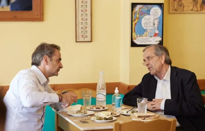 Ο Κυριάκος Μητσοτάκης στο ίδιο τραπέζι με τον Αντώνη Σαμαρά, στη Μεσσηνία. Παρασκευή 21 Απριλίου 2023 (φωτ.: Γραφείο Τύπου Πρωθυπουργού / Δημήτρης Παπαμήτσος)