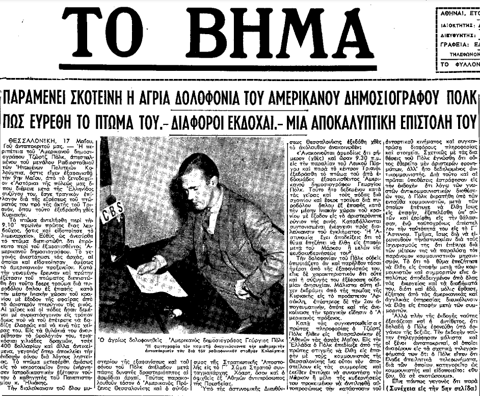 MN: Και σε αυτό το πλαίσιο, ο Τζορτζ Πολκ, όπως αναφέρατε, πήγε να εργαστεί στην Ελλάδα ως ανταποκριτής για το CBS News. Ποια ήταν η φύση της δημοσιογραφίας του Τζορτζ Πολκ, οι ανταποκρίσεις του από την Ελλάδα και πώς αντέδρασαν οι αρχές τόσο στην Ελλάδα όσο και στην πατρίδα τους εκείνη την εποχή; Φαίνεται ότι δεν άργησε πολύ να κάνει αισθητή την παρουσία του στην Ελλάδα.