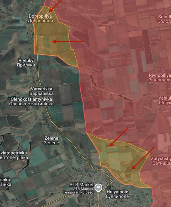 Μέτωπο #Χουλιάιπολε – +7,95 τετραγωνικά μίλια προς τη Ρωσία – Οι ρωσικές δυνάμεις κατέλαβαν το χωριό Ντομπροπιλιά και προέλασαν στο βόρειο τμήμα του Χουλιάιπολε. Kαι οι στρατιώτες προέλασαν επίσης προς τον οικισμό Ζελενόε.Ρωσικές, μονάδες προελαύνουν προς τη Βαρβαρόφκα βόρεια του Xουλιάιπολε, με ομάδες εφόδου να επιχειρούν στα όρια του οικισμού.