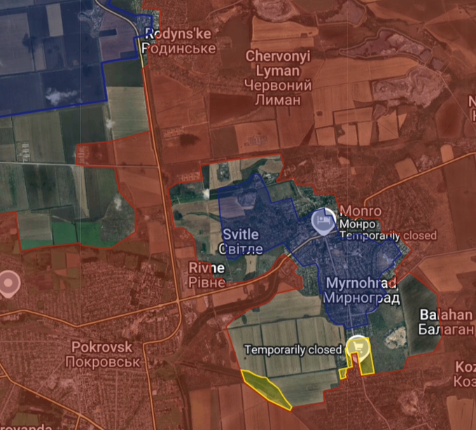 Στην κατεύθυνση Ντομπροπίλια, οι ρωσικές δυνάμεις συνέχισαν να προελαύνουν βορειοδυτικά του Ποκρόφσκ και στον θύλακα Μίρνοχραντ. Στα βορειοδυτικά, οι ρωσικές δυνάμεις συνέχισαν να προχωρούν δυτικά κατά μήκος της σιδηροδρομικής γραμμής, καταλαμβάνοντας νέες θέσεις στους ανεμοφράκτες. Επίσης, εδραιώθηκαν στο νοτιοανατολικό τμήμα του Χρίσυνε, πριν προωθηθούν βορειότερα στους ανατολικούς δρόμους του χωριού. Στα νοτιοανατολικά, οι ρωσικές δυνάμεις κατέλαβαν το τελευταίο τμήμα της σιδηροδρομικής γραμμής δυτικά του Μίρνοχραντ. Κατέλαβαν επίσης άλλα 11 πολυώροφα κτίρια στην περιοχή Ζαπάντι του Μίρνοχραντ, μαζί με το σχολείο αρ. 6, και εισήλθαν στην κατοικημένη περιοχή χαμηλού ύψους στα βόρεια, όπου κατέλαβαν τουλάχιστον έξι οικοδομικά τετράγωνα σπιτιών.