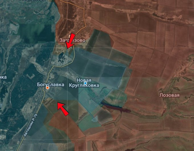 #Κουπιάνσκ Ρωσικές στρατιωτικές μονάδες βρίσκονται στη διαδικασία κατάληψης του χωριού Μπογκουσλάβκα μετά το Ζαγκρίοβο, προελαύνοντας γρήγορα νότια κατά μήκος της Οδού 79 προς το Σλαβιάνσκ.