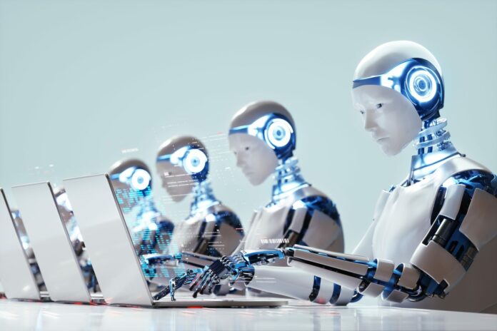 Ψηφιακά δημιουργημένη εικόνα με μία σειρά ρομπότ που χρησιμοποιούν φορητούς υπολογιστές.