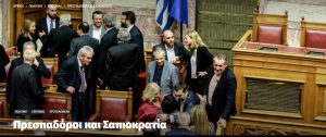 Σαπιοκρατία επικρατεί σε ολόκληρο το πολιτικό σύστημα. Ο πολιτικαντισμός οδηγεί σε βαθύτατη σήψη και ευτελισμό άνευ προηγουμένου. Σκηνές απείρου κάλλους εκτυλίχθηκαν δημοσίως, με εξαγορές, μεταγραφές και δανεικούς. Με αποσαθρώσεις κομμάτων και αλληλοκαρφώματα. Για να προωθηθεί μια εθνική μειοδοσία και να εξυπηρετηθούν τα συμφέροντα των μεγάλων δυνάμεων.