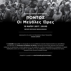 Το LIVEMEDIA θα προβάλλει το ντοκιμαντέρ παραγωγής του, «Πόντος οι Μεγάλες Ώρες», στις 10 Μαΐου 2017 και ώρα 20:00, στο Μέγαρο Μουσικής Θεσσαλονίκης, στα πλαίσια των εκδηλώσεων τιμής και μνήμης της 19ης Μαΐου για τη Γενοκτονία των Ελλήνων του Πόντου.