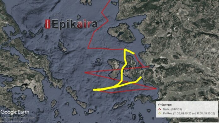 Κίτρινη γραμμή το στίγμα του Piri Reis από 11:20-09/10/25 μέχρι 11:20-10/10/25. Κόκκινη γραμμή οι συντεταγμένες της Navtex (0863/25).