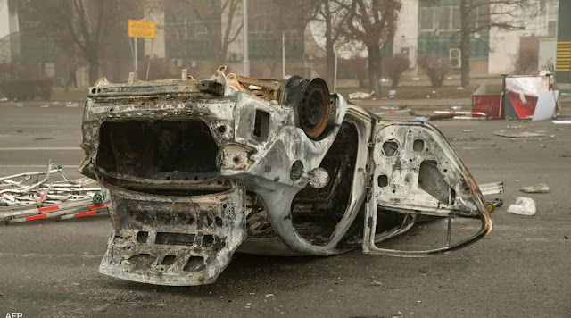 Ο πρόεδρος του Καζακστάν κατηγόρησε μαχητές από το Αφγανιστάν, τη Μέση Ανατολή και την Κεντρική Ασία ότι βρίσκονται πίσω από την πρόσφατη βία στη χώρα του.(φωτογραφία: καμένο αυτοκίνητο στη διάρκεια των ταραχών στη χώρα)