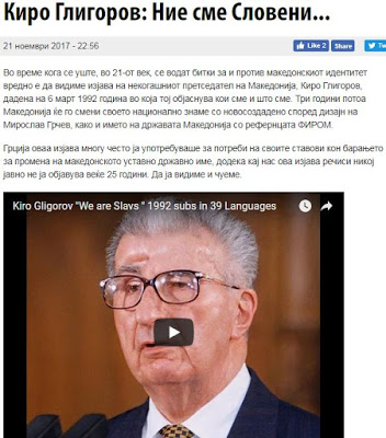 «Κίρο Γκλιγκόροφ: Είμαστε Σλάβοι»«Σε μια εποχή που αγωνιζόμαστε, ακόμη και στον 21ο αιώνα, υπέρ η κατά της ‘μακεδονικής’ ταυτότητας, είναι σημαντικό να δείτε τη δήλωση του πρώτου προέδρου μας Κίρο Γκλιγκόροφ, που την έκανε στις 6 Μαρτίου του 1992, στην οποία εξηγεί ποιοι είμαστε και τι είμαστε»,γράφει σε άρθρο της η σλαβική εφημερίδα των Σκοπίων «Βέτσερ».