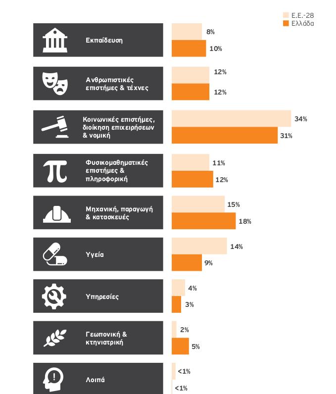 Στο γράφημα αποτυπώνεται η κατανομή φοιτητών ανά τομέα σπουδών στην Ελλάδα και στην Ευρωπαϊκή Ενωση: