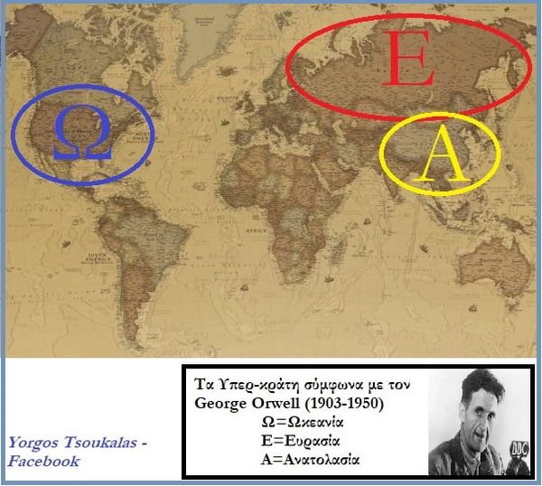 Όμως, ο George Orwell έγραψε το 1949 για τρία Υπερ-κράτη, όπως τα αποκαλούσε, την Ωκεανία (εννοώντας τις Η.Π.Α. που ήταν θαλάσσια δύναμη), την Ευρασία (εννοώντας την Ρωσία) και την Ανατολασία (εννοώντας την Κίνα), που θα είχαν το ίδιο οικονομικό σύστημα! Ο George Orwell αποκαλούσε την ιδεολογία του δημοκρατικού καπιταλισμού ως ΑΓΓΣΟΣ στην λεγόμενη από τον ίδιο ως “Νέα Ομιλία” (το ΑΓΓΣΟΣ ήταν ένα αρκτικόλεξο που σήμαινε “Αγγλικός Σοσιαλισμός”), την ιδεολογία της σύγχρονης Ρωσίας ονόμαζε “Νεομπολσεβικισμό”, ενώ τέλος την κινεζική κρατική ιδεολογία ως “Εξάλειψη του Εγώ” ή “Θανατολατρία”. Παράλληλα προέβλεψε την έντεχνη αποφυγή για δεκαετίες των παγκοσμίων πολέμων παρά την εξοικείωση των κοινωνιών μέσω των ΜΜΕ με το θέαμα των νεκρών σε τοπικούς και περιφερειακούς πολέμους – αλλά και ότι η Γερμανία και η Γαλλία θα έφταναν και οι δυο μαζί περί τα εκατό εκατομμύρια ανθρώπων και πως θα ήταν πολιτισμικά στο ίδιο επίπεδο με τις Η.Π.Α. Αναφέρεται ακόμη και στην γνωστή άγνοια ξένων γλωσσών των Αμερικανών, Ρώσων και Κινέζων, που ως γνωστόν είναι από τους λιγότερο γλωσσομαθείς λαούς, μιλώντας οι περισσότεροι μόνο τις μητρικές γλώσσες τους, τα αγγλικά, τα ρώσικα και τα μανδαρίνικα αντίστοιχα. Περιέγραψε και την αδυναμία της Ευρώπης η οποία θα παραμένει βορά και εύκολη λεία για τα τρία Υπερ-κράτη. Παρακάτω, ακολουθεί ένα επίκαιρο απόσπασμα από το βιβλίο του George Orwell, “1984”: