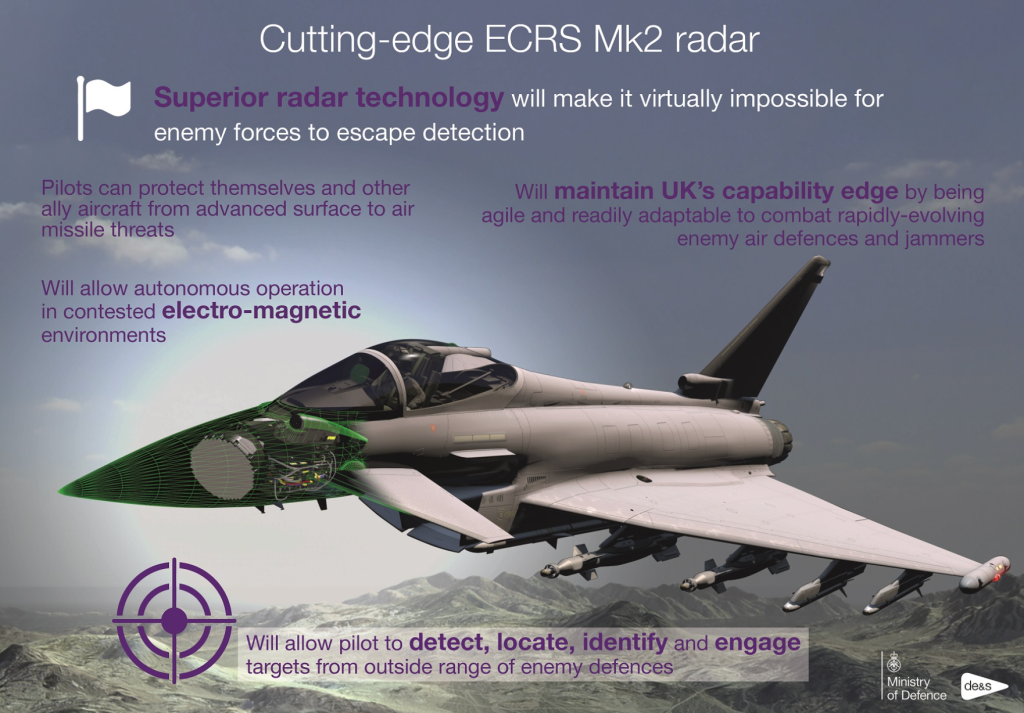 Αυτές οι δραστηριότητες περιλαμβάνουν την ενσωμάτωση ενός νέου, πολύ πιο ικανού ραντάρ ενεργού ηλεκτρονικής σάρωσης (AESA) στο Typhoon, για το οποίο μπορείτε να διαβάσετε περισσότερα εδώ. Ένα ραντάρ AESA, σε συνδυασμό με το APKWS, θα ήταν ιδιαίτερα χρήσιμο για την αντιμετώπιση drones και πυραύλων cruise. Το AESA μπορεί να εντοπίζει και να παρακολουθεί στόχους σε πολύ μεγαλύτερες αποστάσεις, ταχύτερα και με μεγαλύτερη ακρίβεια. Αυτό ισχύει επίσης και για μικρότερες απειλές, συμπεριλαμβανομένων εκείνων με περιορισμένο ίχνος ραντάρ ή που πετούν σε πολύ χαμηλά ύψη, τις οποίες τα παλαιότερα ραντάρ δυσκολεύονται να εντοπίσουν.