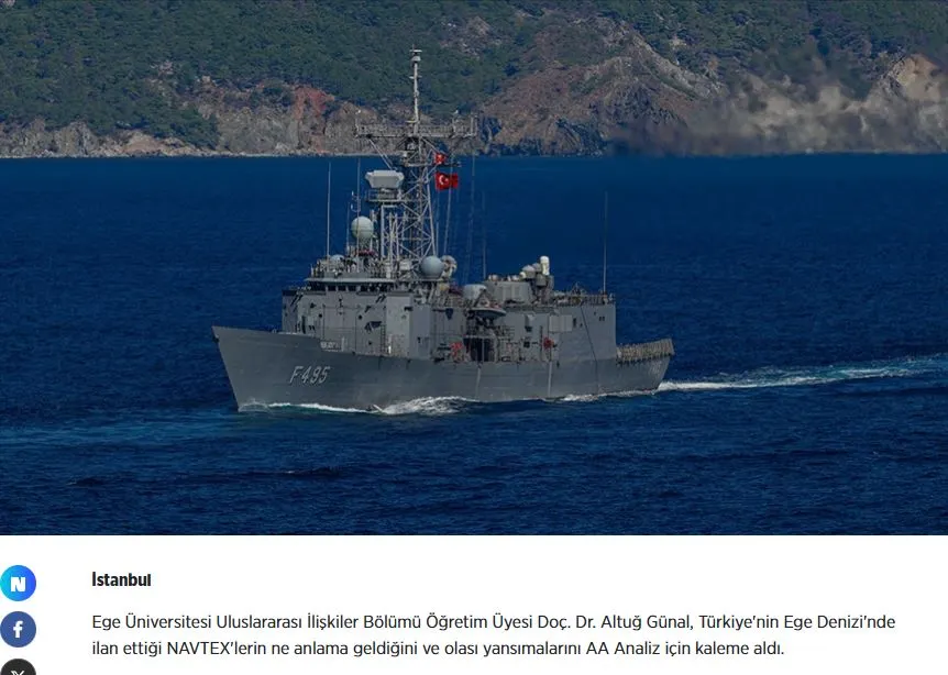 Ο καθηγητής Αλτούγκ Γκιουνάλ, μέλος ΔΕΠ στο Τμήμα Διεθνών Σχέσεων του Πανεπιστημίου ‘Ege’, έγραψε μια ανάλυση για το AA εξηγώντας τη σημασία και τις πιθανές επιπτώσεις των προειδοποιήσεων NAVTEX που εξέδωσε η Τουρκία στο Αιγαίο Πέλαγος.