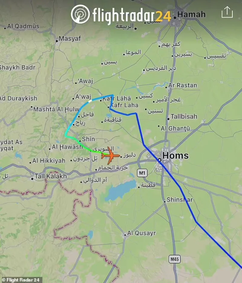 Δεδομένα από τον ιστότοπο παρακολούθησης πτήσεων Flighτradar24 έδειξαν ένα αεροσκάφος, που πιστεύεται ότι μετέφερε τον Άσαντ, να απογειώνεται τα χαράματα της Κυριακής από την πρωτεύουσα της Συρίας.