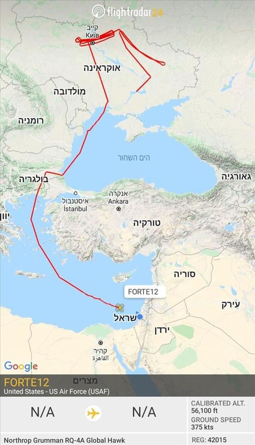 Στην φωτογραφία: Η γραφική απεικόνιση της πτήσης του αμερικανικού κατασκοπευτικού drone τύπου RQ4A-Global Hawk από τον ισραηλινό μεσογειακό εναέριο χώρο με κατεύθυνση την Ουκρανία (με φερόμενο τόπο απογείωσης τα Ηνωμένα Αραβικά Εμιράτα) κατά τις πρώτες πρωινές ώρες της 24/1, όπως είχε καταγραφεί από την ηλεκτρονική εφαρμογή κινητής τηλεφωνίας FlightRadar24. Η συγκεκριμένη φωτογραφία δημοσιεύθηκε στην ιστοσελίδα της ισραηλινής κρατικής ραδιοτηλεόρασης.