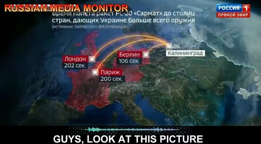 Στη συνέχεια, παρουσιάστηκε ένας χάρτης που έδειχνε πόσο γρήγορα οι πύραυλοι θα μπορούσαν να χτυπήσουν τις πρωτεύουσες του Ηνωμένου Βασιλείου, της Γαλλίας και της Γερμανίας, υποδεικνύοντας ότι οι πύραυλοι θα μπορούσαν να εκτοξευθούν από το Καλίνινγκραντ.
