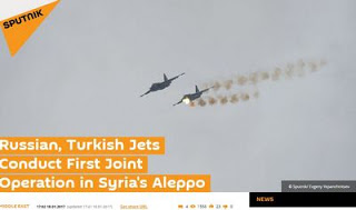 «Εννέα μαχητικά αεροσκάφη των ρωσικών αεροδιαστημικών δυνάμεων- ήτοι τεσσάρων Su-24M, τεσσάρων Su-25 και ενός Su-34 βομβαρδιστικού, καθώς και οκτώ μαχητικά της τουρκικής πολεμικής αεροπορίας- ήτοι τέσσερα F-16 και τέσσερα F-4 μαχητικά, ενεπλάκησαν στην εναέρια εκστρατεία έπειτα από συμφωνία με τις συριακές αρχές, όπως δήλωσε στη Μόσχα ο Ρώσος στρατιωτικός Σεργκέι Ρουντσκόι, επικεφαλής της επιχειρησιακής διεύθυνσης των ρωσικών δυνάμεων.