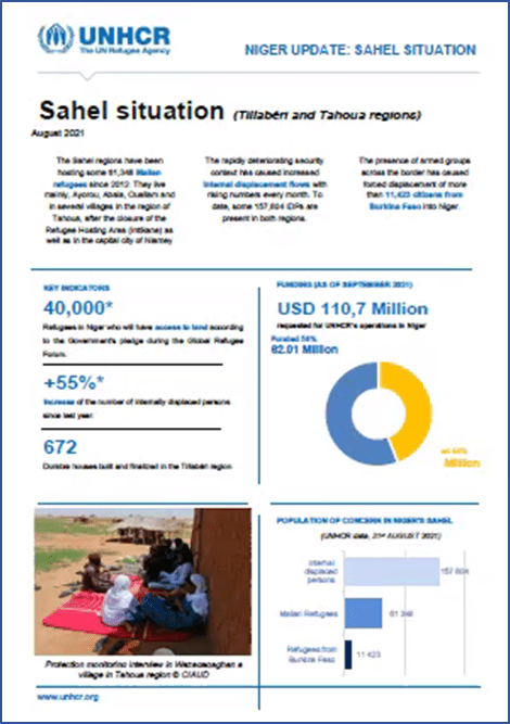 «Οι περιοχές του Σαχέλ φιλοξενούν από το 2012 περίπου 61.348 πρόσφυγες από το Μάλι. Αυτοί, ζουν κυρίως, στις περιοχές Αγιόρου, Αμπάλα, Οουλάμ και σε αρκετά χωριά στην περιοχή Ταχούα, μετά το κλείσιμο της Δομής Φιλοξενίας Προσφύγων (Ιντικάνε) καθώς και στην πρωτεύουσα της Νιαμέι.