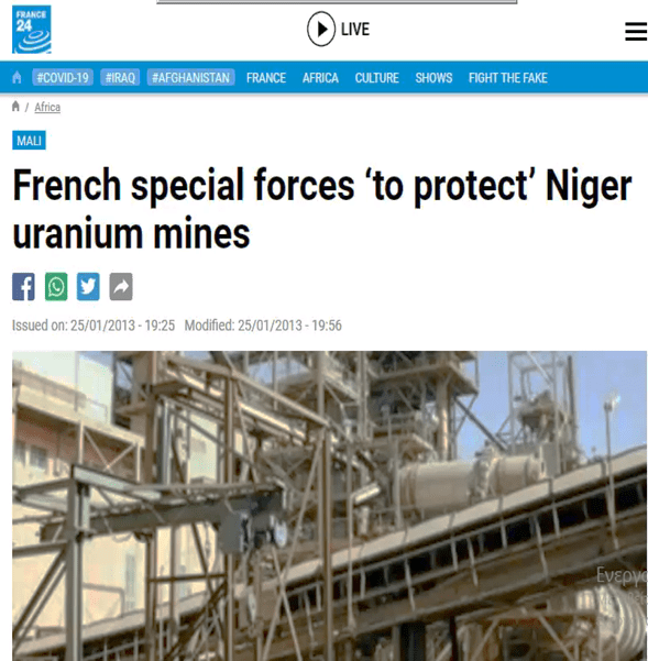 Στις 25.1.2013 Γαλλικά ΜΜΕ , όπως το France 24, βροντοφώναζαν στα άρθρα τους  και καθιστούσαν προς πάσα κατεύθυνση σαφές πως:  «Οι γαλλικές ειδικές δυνάμεις «προστατεύουν» τα ορυχεία ουρανίου του Νίγηρα»….