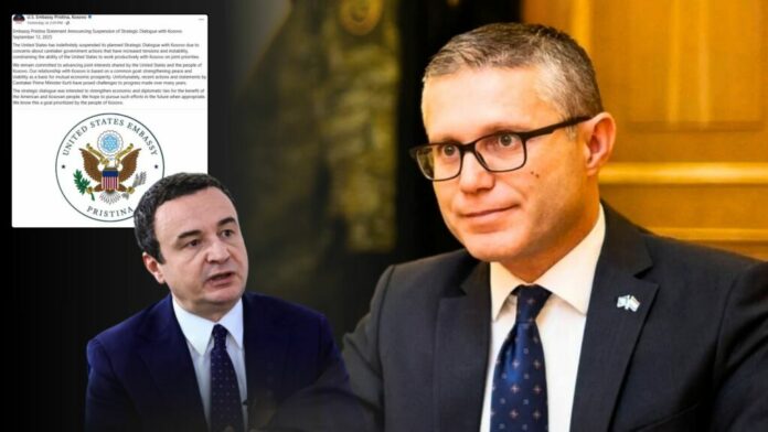 «Οι Ηνωμένες Πολιτείες έχουν αναστείλει επ’ αόριστον τον προγραμματισμένο Στρατηγικό Διάλογο με το Κοσσυφοπέδιο λόγω ανησυχιών για τις ενέργειες της υπηρεσιακής κυβέρνησης, οι οποίες έχουν αυξήσει την ένταση και την αστάθεια, περιορίζοντας την ικανότητα των Ηνωμένων Πολιτειών να συνεργαστούν παραγωγικά με το Κοσσυφοπέδιο σε κοινούς στόχους», ανακοίνωσε η πρεσβεία.