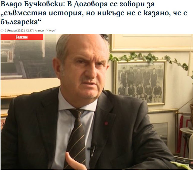 Ο πρώην πρωθυπουργός της Βόρειας Μακεδονίας Βλάντο Μπουτσκόφσκι, ο οποίος είναι ειδικός απεσταλμένος των Σκοπίων για τη Βουλγαρία περισσότερο από ένα χρόνο, δήλωσε στο Radio Free Europe ότι η Συνθήκη Φιλίας και Καλής Γειτονίας περιλαμβάνει τον όρο «κοινή ιστορία», αλλά είπε ότι δεν είναι βουλγαρική, όπως ισχυρίζονται οι Βούλγαροι πολιτικοί, γράφει το βουλγαρικό ειδησεογραφικό πρακτορείο Fokus.