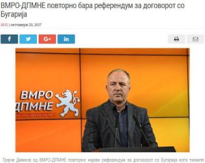 Το VMRO-DPMNE ζήτησε να γίνει δημοψήφισμα για τη συμφωνία με τη Βουλγαρία, όπως δήλωσε ο Τράϊτσε Ντίμκοφ, μέλος του κόμματος.