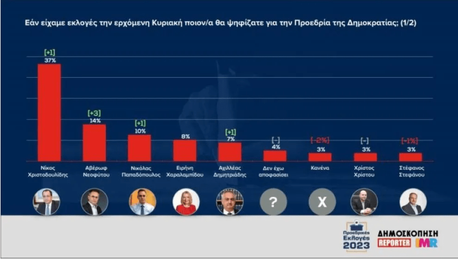 Πέραν των Αβέρωφ Νεοφύτου, Αχιλλέα Δημητριάδη και Χρίστου Χρίστου, την υποψηφιότητα τους επίσημα εξήγγειλαν και οι Γιώργος Κολοκασίδης και Μάριος Ηλιάδης. Στη δημοσκόπηση του REPORTER, κινούνται σε χαμηλά ποσοστά, με τον κ. Κολοκασίδη να καταγραφεί 2% και τον κ. Ηλιάδη 1%.