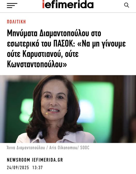 • Ἐπισημαίνω ὅτι τὰ κόμματα δὲν βλέπουν τὴν δυσαρέσκεια τοῦ κόσμου ποὺ βγαίνει στοὺς δρόμους γιὰ νὰ διαμαρτυρηθεῖ γι αὐτὰ ποὺ γράφεις καὶ γιὰ πολλὰ ἀκόμα καὶ δὲν φταίει ἡ Μαρία Καρυστιανοῦ ποὺ ξεσηκώνει ἕναν κόσμο ποὺ δὲν αἰσθάνεται τοὺς πολιτικοὺς μαζί του. Γιατί κοντεύουν νὰ ποῦν ὅτι χαλάει ἡ Μ. Κ. τὸ ἤπιο κλίμα. Οὔτε ἐπιτυγχάνεται τὸ ἤπιο κλίμα ξεχνώντας τὰ προβλήματα. Νομίζω ὅμως ὅτι χρησιμοποιήθηκε ἡ δήλωση τῆς Ἄννας Διαμαντοπούλου ἀπὸ τὰ μέσα παραφράζοντας τὸ συνολικὸ νόημα ποὺ ἀφοροῦσε τά ἐσωκομματικά τοῦ ΠΑΣΟΚ.