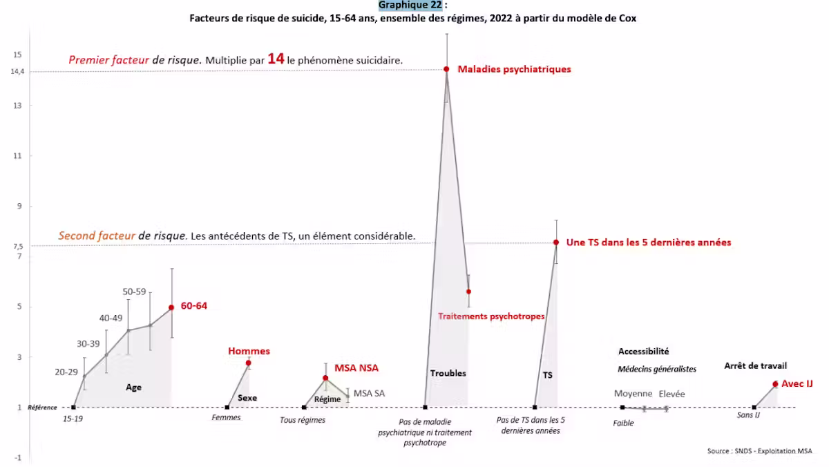 Η έκθεση του 2026 της MSA δείχνει ότι οι μη μισθωτοί αγρότες (για παράδειγμα οι αρχηγοί εκμεταλλεύσεων) είναι εκείνοι που παρουσιάζουν τον υψηλότερο υπερκίνδυνο αυτοκτονίας. Αυτός ο υπερκίνδυνος, περίπου 56,7%, είναι μεγαλύτερος τόσο από αυτόν των μισθωτών αγροτών (40%) όσο και από αυτόν του γενικού πληθυσμού.