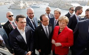 Οι κ.κ. Αλ. Τσίπρας, Φρανσουά Ολάντ και Αγκελα Μέρκελ, στο περιθώριο της Συνόδου στη Μάλτα.