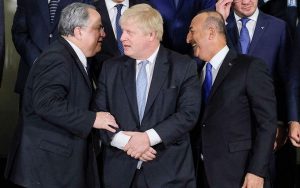 Στο περιθώριο της Συνόδου του ΝΑΤΟ στις Βρυξέλλες, οι ΥΠΕΞ Ελλάδας και Τουρκίας Νίκος Κοτζιάς και Μεβλούτ Τσαβούσογλου συζήτησαν για αρκετή ώρα. Στο στιγμιότυπο, συνεχίζουν να ανταλλάσσουν απόψεις παρά την «παρεμβολή» του Βρετανού ομολόγου τους Μπόρις Τζόνσον.