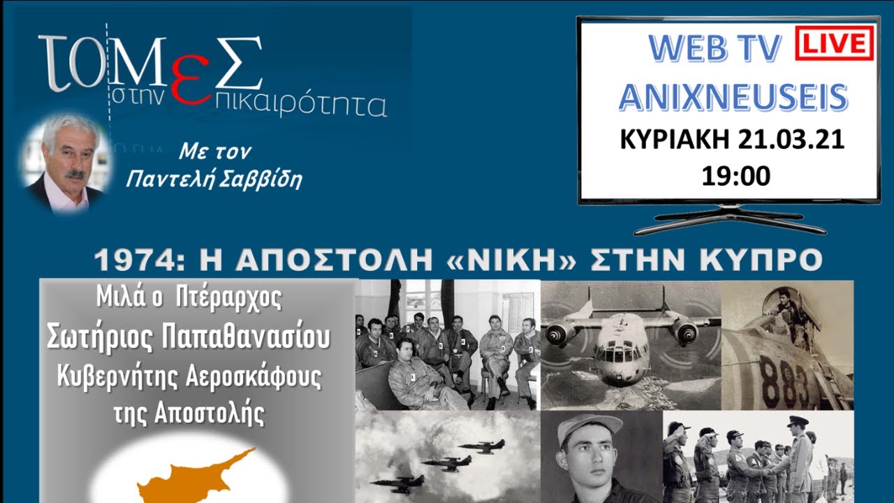 Παρακολουθείστε την συγκλονιστική αφήγηση του Αντισμήναρχου ε.α. Σωτήριου Παπαθανασίου. Στις 21 Ιουλίου 1974 και ενώ εξελισσόταν η εισβολή των Τούρκων στην Κύπρο, μια μυστική αποστολή ξεκίνησε από την Κρήτη για να μεταφέρει καταδρομείς στο νησί. Στην αποστολή συμμετείχε ως κυβερνήτης αεροσκάφους και ο αντισμήναρχος ε.α. σήμερα Σωτήριος Παπαθανασίου. Σαρανταεπτά χρόνια μετά μιλά στις Anixnefseis web tv για την αποστολή εκείνη που δεν αναγνώρισε ποτέ η Ελλάδα. Ο κ. Παπαθανασίου μιλά, ακόμη και για το αντιπραξικόπημα του βασιλιά τον οποίο συνόδευσε.