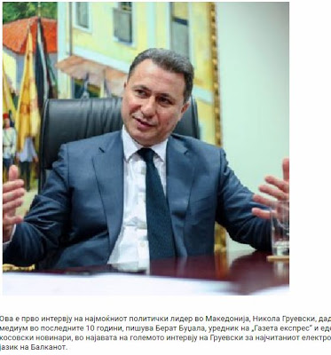 Ο πρώην πρωθυπουργός των Σκοπίων, Νίκολα Γκρούεφσκι και νυν επικεφαλής του μεγαλύτερου κόμματος στο νοτιο σλαβικό κράτος των Σκοπίων, του VMRO-DPMNE, παραχώρησε εκτενή συνέντευξη στην εφημερίδα ‘Express’ του Κοσσυφοπεδίου, την οποία παρουσιάζει στο σλαβικό κοινό, η εφημερίδα ‘Dnevnik’ των Σκοπίων.