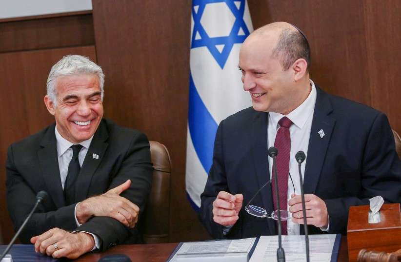 Ο τότε Ισραηλινός Πρωθυπουργός Ναφτάλι Μπένετ και ο Υπουργός Εξωτερικών Γιαΐρ Λαπίντ σε συνάντηση του υπουργικού συμβουλίου στο γραφείο του Πρωθυπουργού στην Ιερουσαλήμ, 19 Ιουνίου 2022. (Φωτο: ALEX KOLOMOISKY/FLASH90)