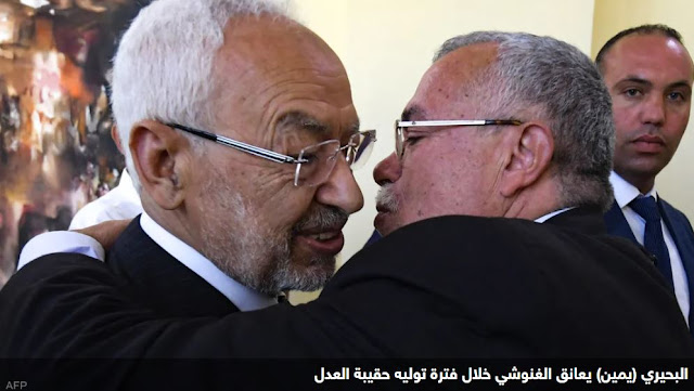 Ο Αλ Μπεχάιρι (δεξιά) αγκαλιάζει τον Ρασίντ Γκανουσί έναν από τους ιδρυτές της Ενάντα κατά τη διάρκεια της θητείας του στο υπουργείο Δικαιοσύνης
