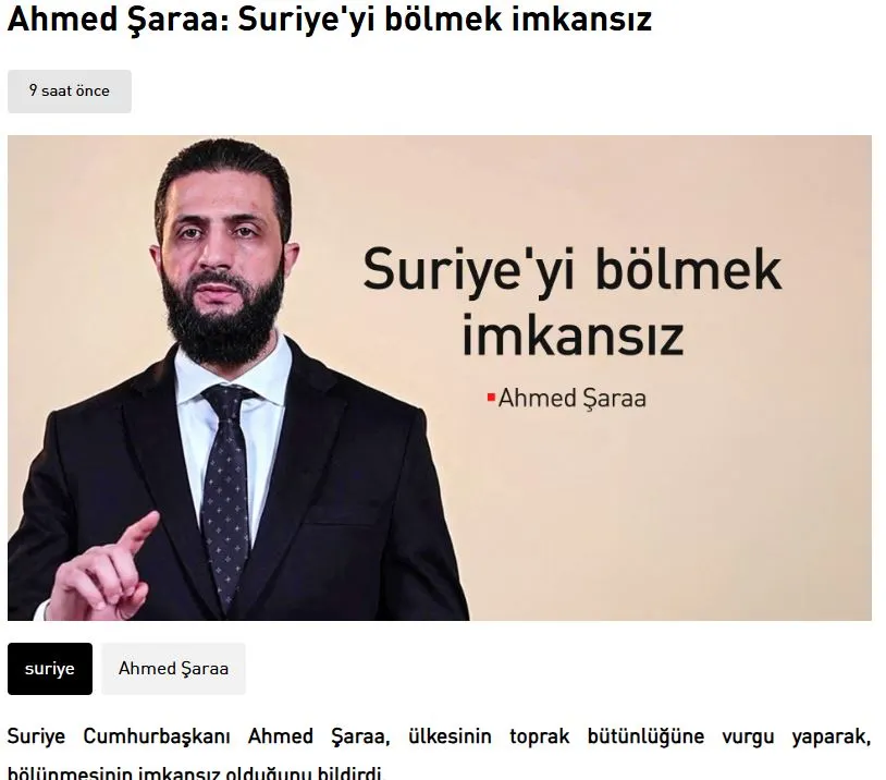Ο Τζολάνι, ο οποίος είπε ότι τις συγκρούσεις στη Σουβέιντα εκμεταλλεύεται το Ισραήλ, απαρίθμησε τα βήματα «λύσης» ως «τη διασφάλιση της κατάπαυσης του πυρός, την επιστροφή των εκτοπισμένων, την κοινωνική ειρήνη, την απόδοση ευθυνών στους δράστες των παραβιάσεων, μια τετραμερή συμφωνία με τις SDF, συμπεριλαμβανομένης της Τουρκίας και των ΗΠΑ».
