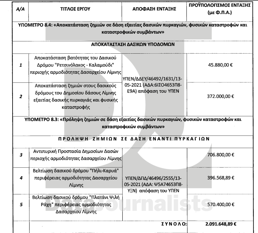 Ο δασολόγος παρέθεσε επίσης όλα τα έργα αντιπυρικής προστασίας που είχαν προβλεφθεί για το 2021. Επρόκειτο για έργα συνολικής αξίας 2,091 εκατ. ευρώ τα οποία οποία αφορούσαν σε «αποκατάσταση ζημιών σε δάση εξαιτίας δασικών πυρκαγιών, φυσικών καταστροφών και καταστροφικών συμβάντων». Πιο αναλυτικά, τα έργα αφορούσαν σε «αποκατάσταση βατότητας του Δασικού Δρόμου “Ρετσινόλακος – Καλαμούδι” περιοχής αρμοδιότητας Δασαρχείου Λίμνης» ύψους 45.580 ευρώ, «αποκατάσταση ζημιών στους δασικούς δρόμους του Δημοσίου δάσους Λίμνης εξαιτίας δασικής πυρκαγιάς και φυσικής καταστροφής» ύψους 372.000 ευρώ, «Αντιπυρική Προστασία Δημοσίων Δασών περιοχής αρμοδιότητας Δασαρχείου Λίμνης» κόστους 706.800 ευρώ, «Βελτίωση δασικού δρόμου “Πήλι-Καρυά” περιφέρειας αρμοδιότητας Δασαρχείου Λίμνης» ύψους 396.568 και «Βελτίωση δασικού δρόμου “Πλατάνι Ψιλή Ράχη” περιφέρειας αρμοδιότητας Δασαρχείου Λίμνης» ύψους 570.400 ευρώ.