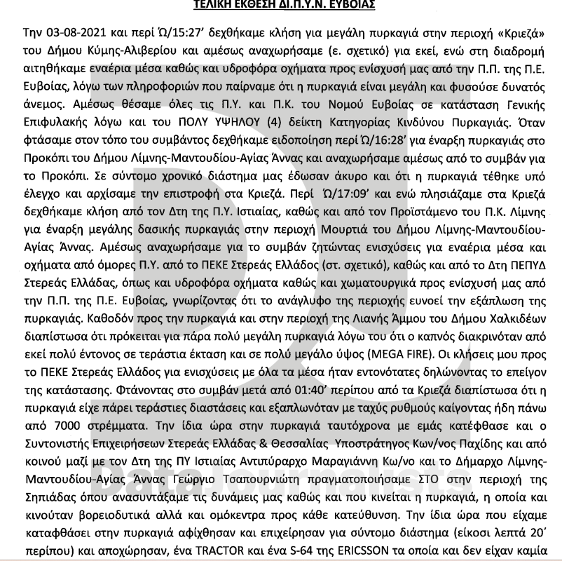Ένα ακόμη στοιχείο που έχει εξαιρετικό ενδιαφέρον είναι η «τελική έκθεση ενεργειών της ΔΙ.Π.Υ.Ν. Ευβοίας για τον Φάκελο Καταστροφής της πυρκαγιάς» την οποία συνέταξε αξιωματικός της Πυροσβεστικής που υπηρετεί στην Εύβοια. Η έκθεση περιλαμβάνει αναλυτικά όσα έγιναν από την πλευρά των Πυροσβεστικών Υπηρεσιών καθόλη τη διάρκεια της καταστροφικής πυρκαγιάς. Αυτό που όμως έχει ενδιαφέρον είναι η αναφορά για τα εναέρια μέσα και τον τρόπο που επιχειρούσαν. Χαρακτηριστικά είναι για όσα αναφέρονται για τις 3 Αυγούστου του 2021 την ημέρα που εκδηλώθηκε η πυρκαγιά.