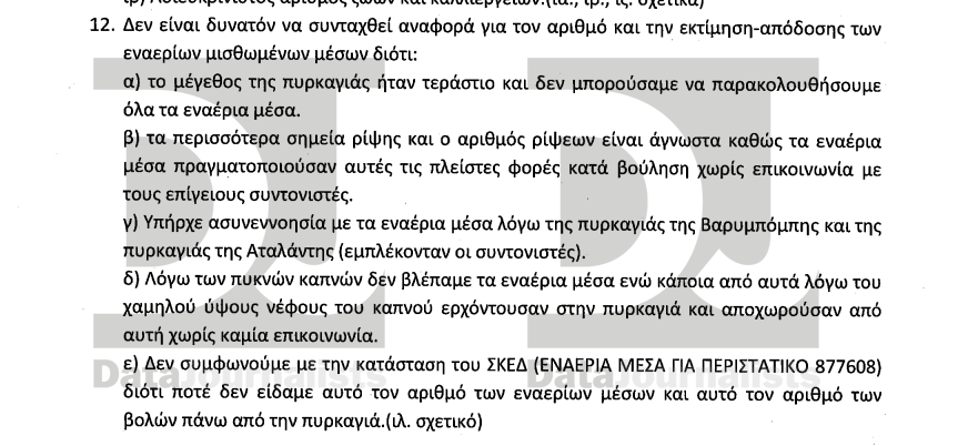 Η περιγραφή του αξιωματικού δεν είναι σοκαριστική μόνο για τις πρώτες ώρες της πυρκαγιάς αλλά για τα συμπεράσματα σχετικά με τις δράσεις των εναέριων μισθωμένων μέσων συνολικά. Όπως τόνισε, «δεν είναι δυνατόν να συνταχθεί αναφορά για τον αριθμό και την εκτίμηση-απόδοσης των εναερίων μισθωμένων μέσων» για τέσσερις λόγους. Ο πρώτος έχει να κάνει με το μέγεθος της πυρκαγιάς, το οποίο «ήταν τεράστιο και δεν μπορούσαμε να παρακολουθήσουμε όλα τα εναέρια μέσα». Ο δεύτερος λόγος έχει να κάνει με την έλλειψη επικοινωνίας των εναέριων μέσων με τους επίγειους συντονιστές.
