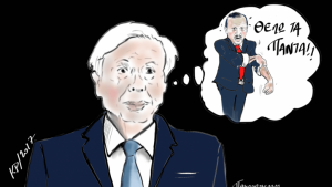 Αντίθετα… Θεωρώ ότι η κριτική από τους Έλληνες ναζί και γενικά την άμυαλη ακροδεξιά, με τις κραυγές περί «προδοσίας», αλλά και των κομμάτων του δημοκρατικού τόξου, ήταν υπερβολική. Αναφερόμενος στην αντιπολίτευση καταγράφω την αντίδρασή της αλλά τι διαφορετικό θα έκανε; Ειλικρινά ερωτώ: Θα αρνείτο ο πρόεδρος της Νέας Δημοκρατίας κ. Κυριάκος Μητσοτάκης την εισήγηση της Ουάσιγκτον; Και θα έλεγε κάτι διαφορετικό στον Σουλτάνο;