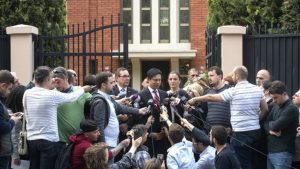 US Deputy Secretary of State for Europe and Asia Hoyt Brian Yee (C) talks to the journalists in front of the US Residency in Skopje, the FYROM. EPA, GEORGI LICOVSKI MAY 11, 2017